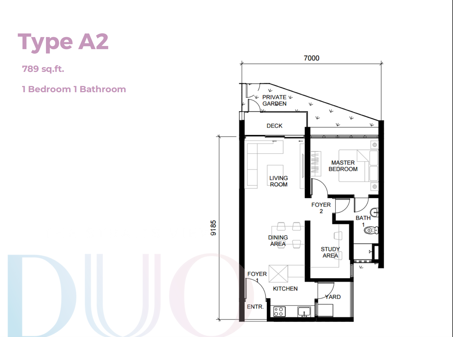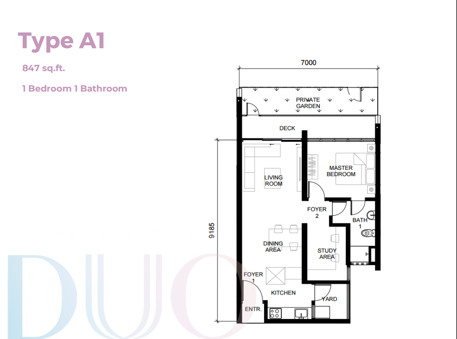 Type A / A1 / A2: 1 Bedroom + 1 Bathroom (645 – 847 sqft)