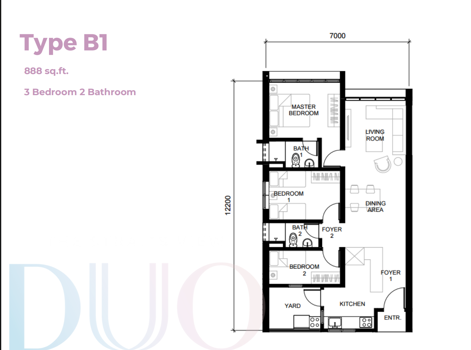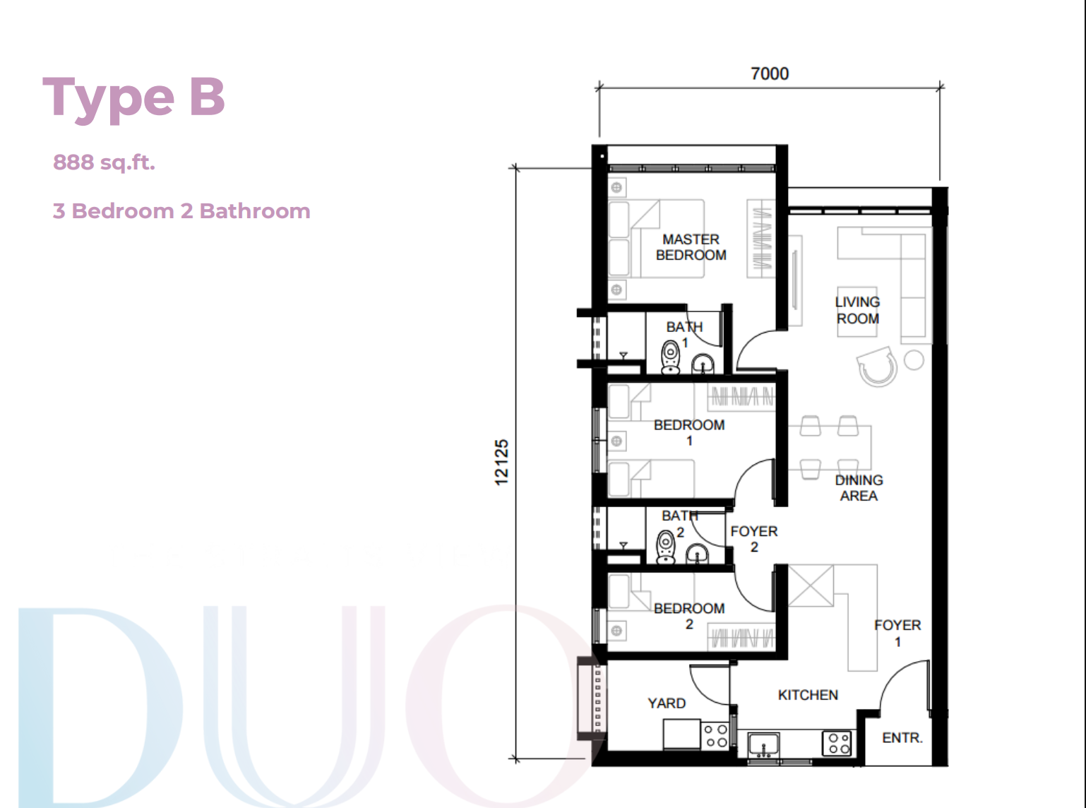 Type B / B1 / B2: 3 Bedroom + 2 Bathroom (888 – 937 sqft)