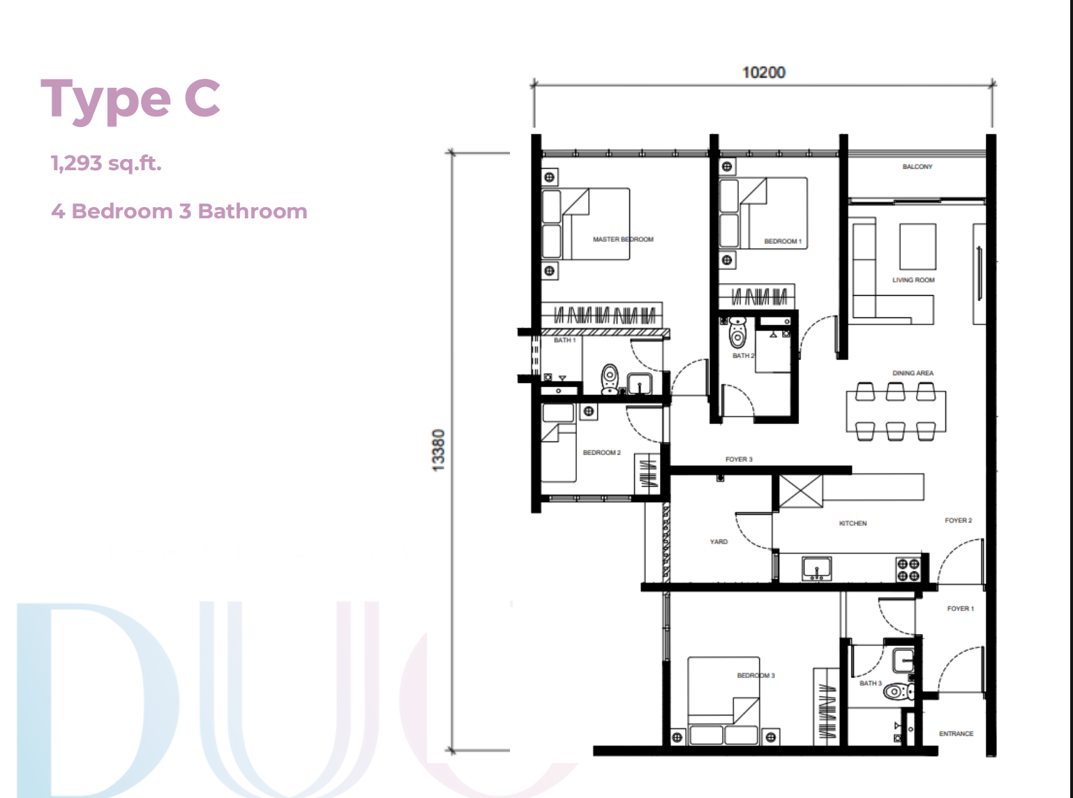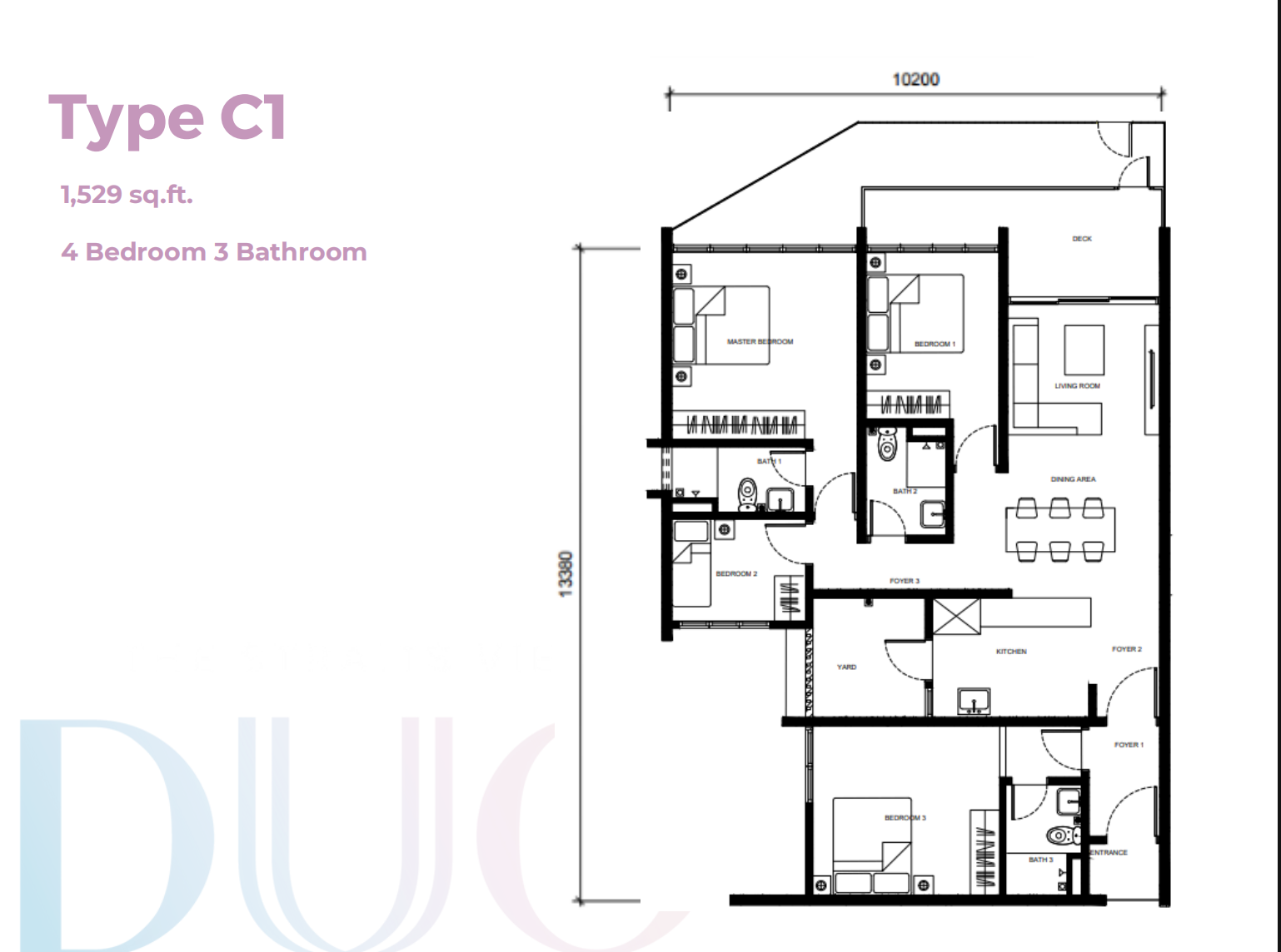Type C / C1: 4 Bedroom + 3 Bathroom (1,293 – 1,529 sqft)