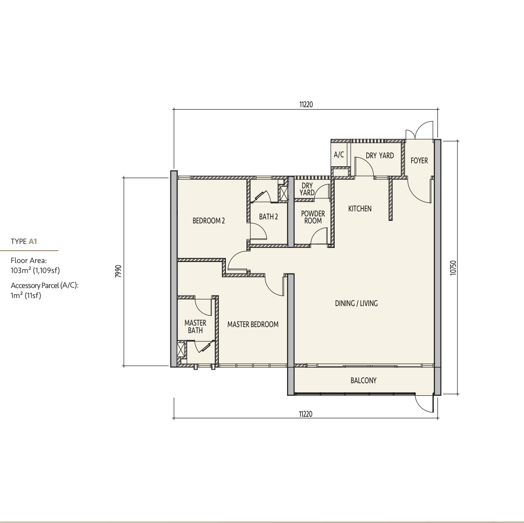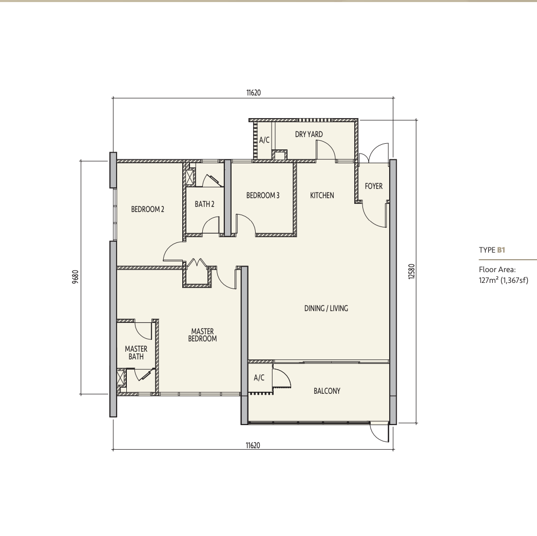 | Unit Size | Type A - 1033sf (2+1 Bedroom + 2 Bathroom) Type A1 - 1109sf (2+1 Bedroom + 2 Bathroom ) Type A2 - 1033sf (2+1 Bedroom + 2 Bathroom) Type B - 1292sf (3 Bedroom + 2 Bathroom) Type B1 - 1367sf (3 Bedroom + 2 Bathroom) |