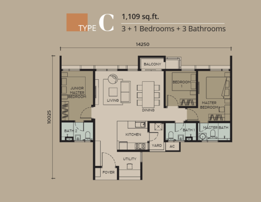 Type C - 1109sf (3 Bedroom + 2 Bathroom)