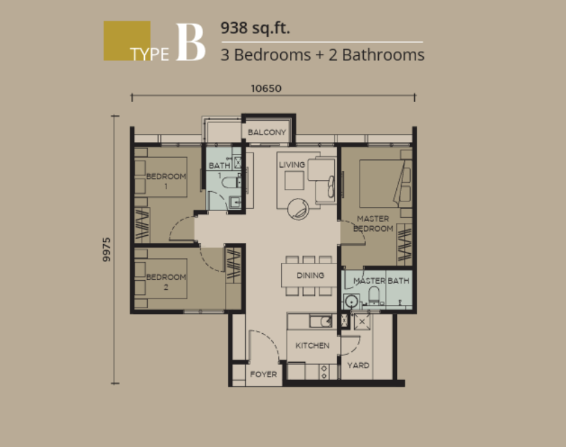 Unit Size Type B - 938sf (3 Bedroom + 2 Bathroom)